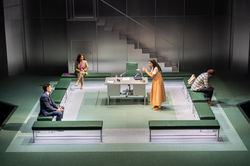 'Lightboxes descend from above, pressing down on the actors oppressively as they pace around Frankie Bradshaw’s cold, austere set, part sleek office, part high-security prison, all clanging steel surfaces and Perspex walls' **** The Stage