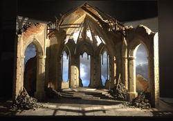 In designing Saint Joan for Belfast’s Lyric Theatre, I wanted to create a space in which the various epic battles within this historical drama could play out. We first see a struggle for national independence, but the wider battle is of Joan’s relationship with the church as we explore the dichotomy of a war hero who is inspired by God but is simultaneously breaking every convention of The Church. I was inspired by the striking and oppressive gothic architecture of the medieval era, and also by the religious and political turmoil in Ireland’s recent history. Through transitions across the production from light to dark, from medieval to WW1 to present day civil war, and from lush fertility to a war-torn desolate landscape, I aimed to use this production to delve into what it means to be an extremist fighting for freedom in both Joan’s world and in our world today.